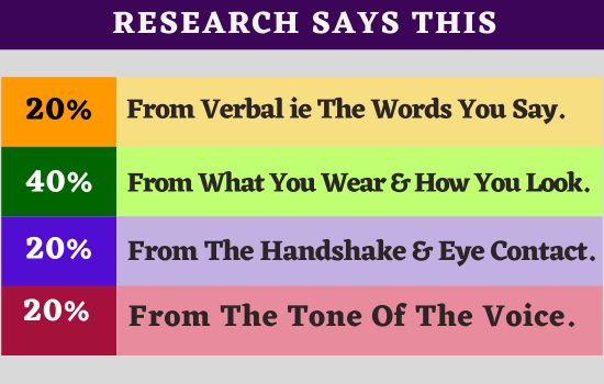 20% is from verbal ie the words you say. 40% is from what you wear and how you look. 20% is from the handshake & eye contact. 20% is from the tone of voice.